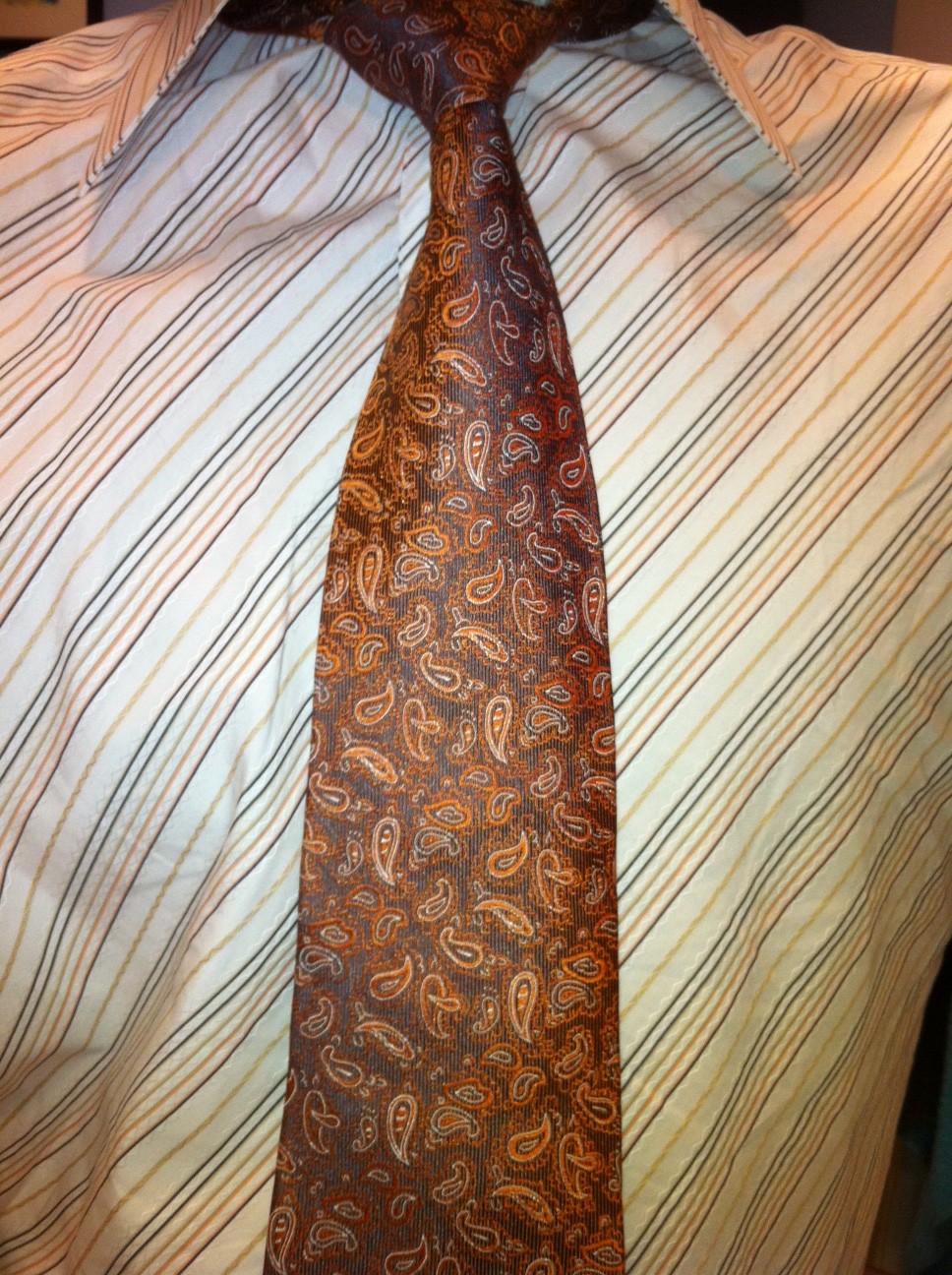 I get a little bit better (not everyone would agree) with Lightning Rounder #2…this Enrico Rossini paisley tie has a nice orange/brown tinge (not everyone would think that sounds great), and matches up nicely with my shirt’s stripes (not everyone uses parentheses three times in a paragraph).