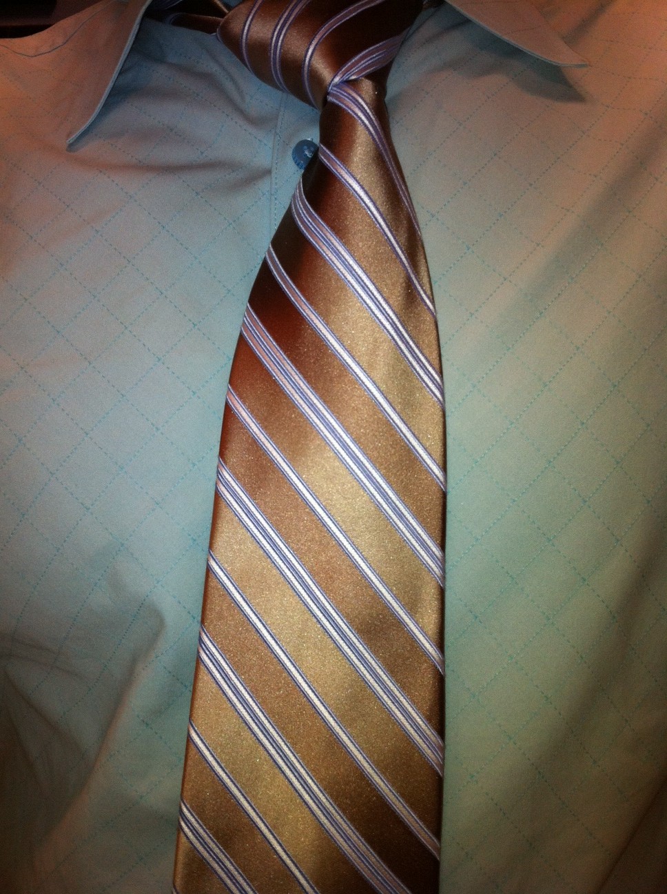 Aaaaand, back to the silk with this brown and blue striped number from Jones New York. While it would be somewhat muted on a plain white shirt, I decided to doll it up with this aquamarine shirt.