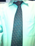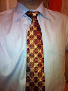 And this next tie is pretty funny. From a designer called Linnea Franco, I picked it up at a resale shop, probably Unique Thrift Store. But, I didn’t really check the length when I bought it. So, when I put it on, it only came down between my bellybutton and my medulla oblongata. Wait, that’s not right, that’s in the brain. Sternum? It’s the sternum! Dang brain. Anyway, the tie was obviously built for a child, or Peter Dinklage. Soooo, I threw a sweater over it. Silly me for not taking the pic in its infinite shortitude. Wimp.