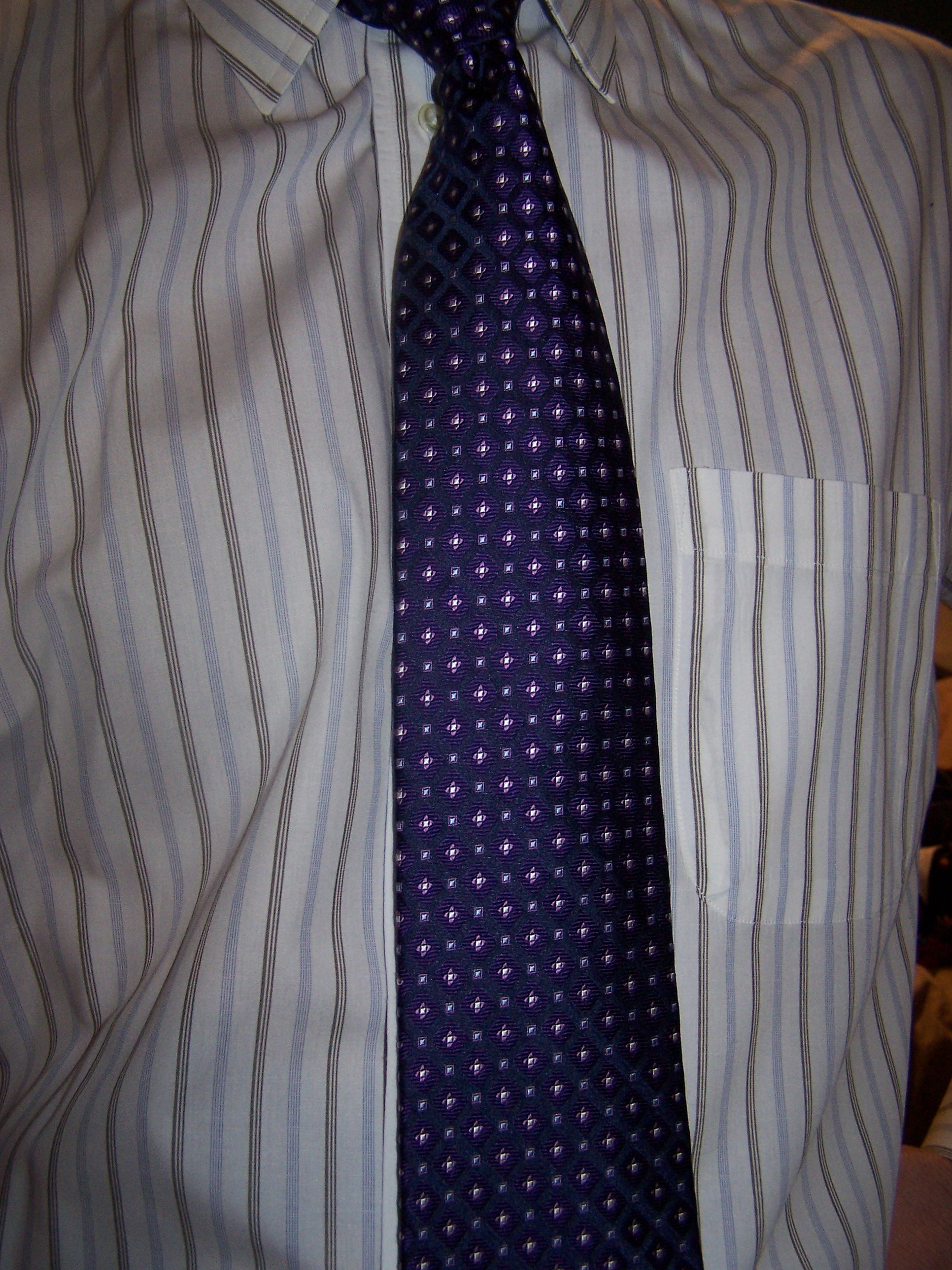 The Tie du Jour is from Eagle Shirtmakers. It’s a well-made tie, very good quality fabric, even if it’s a simple purple-based pattern. I can tell a decent tie if the knot holds its shape. Speaking of knots, I usually tie a half-windsor, which is symmetrical and tends to have a larger knot than a four-in-hand. If anyone ever needs help with a knot, I can certainly help. It’d be a lot easier if you go to Tie-a-Tie.net, and let bespectacled gentleman Johann Isemer show you how to fire up the Windsor, Half-Windsor, Pratt & Four-in-Hand knots. He says it’s not rocket science.