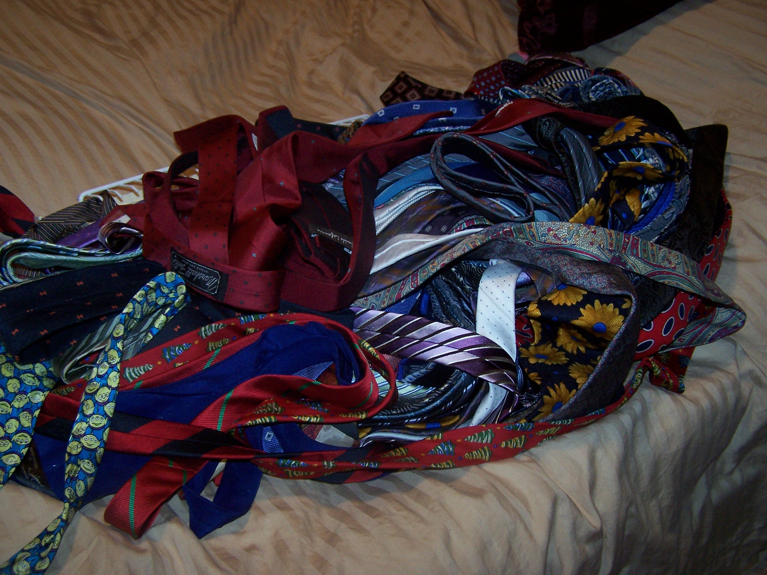 So I had this nice tie rack that was very difficult to move off of the Swedish/Norwegian/Overpricese closet system; try though I might to move them together, all hanging nicely, I screwed up. They ended up making the move in a fresh new kitchen trash bag. Not very pleasant for them, I’m sure, but it did the trick. This pic shows them in their unkempt, unhanging state. Hard to believe all of these (provided I don’t get hit by a bus, or a tailor’s van) will grow up to be Ties du Jour. Sniff…they’re growing so fast.