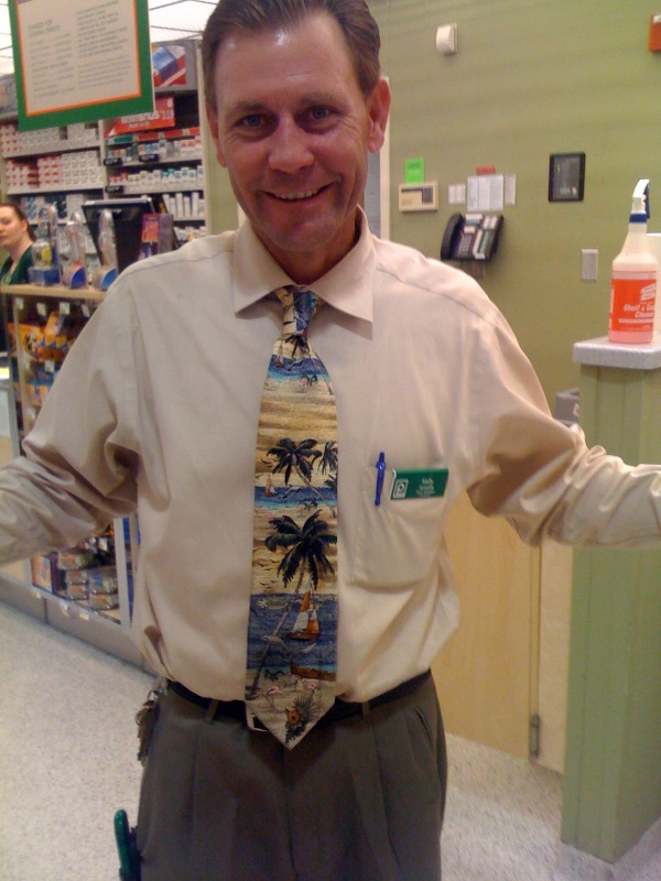 Speaking of Mom, she submitted a Guys With Ties entry, all the way from their local Publix supermarket in Sandestin, Florida. This is the manager, Kelly, with a perfectly Floridian tie. Mom and Dad can actually take their golf cart to this store…but I don’t think they can drive the cart INSIDE it.