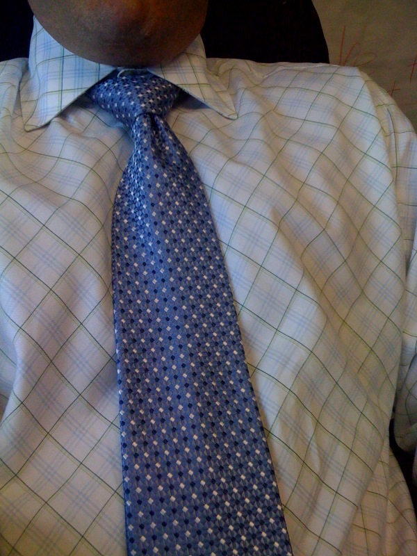 My Tie du Jour is on the bright side, too. Any blue that tries to shine through a grim, gray day works for me. The white dots give it some light; unfortunately the toothpaste stain did, as well. Tasted like Colgate.