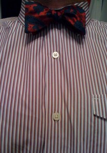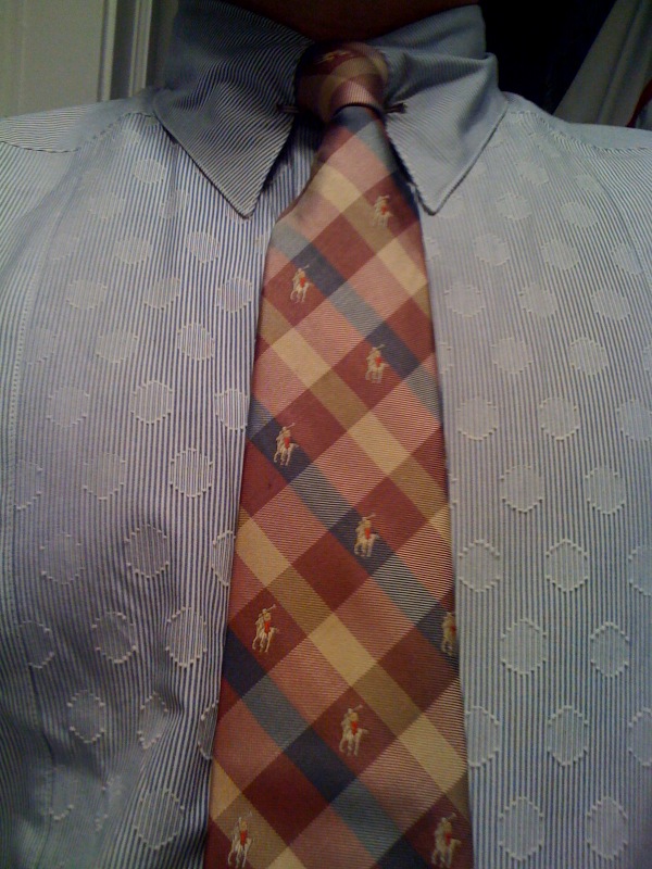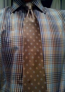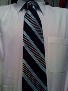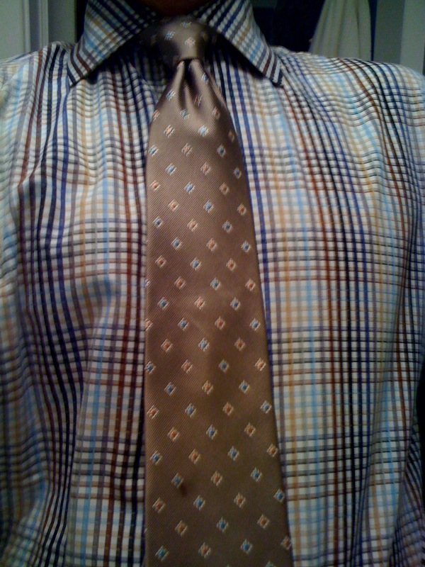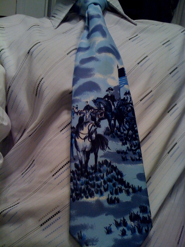 The Tie du Jour is Tie No. 74, methinks. It’s pretty average, looks-wise, but I think I made it work with this shirt. It’s from Lands’ End, and I can’t remember if I got it at their outlet place or if I inherited it from my Dad. No matter. I’ve worn it, and it’s served me well.