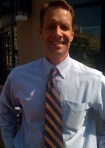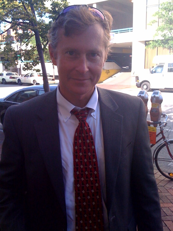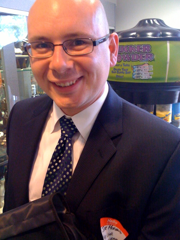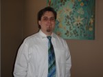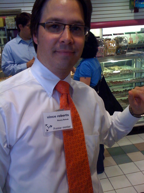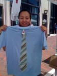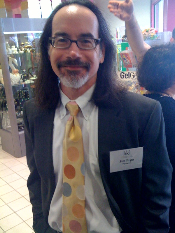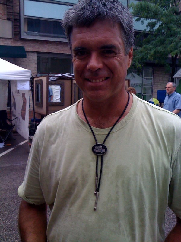 I have a very cool Guy With Tie to share with you today. If you may recall, my cousin, Elizabeth, submitted a very heartfelt comment on behalf of her husband, Tim, vying for a Friday Freebie a few weeks back. She said the colors of the tie, blue and green, matched the colors of their wedding. Awww. Which I missed. Ack. It was a lovely sentiment, and I gladly sent it to Texas with love and C.O.D. Just kidding, I’m not a monster. Anyway, here’s Tim Brehm, sporting the FF tie in front of a painting that they commissioned to represent their floral arrangement. Best wishes to you both…I’m sorry I missed it.