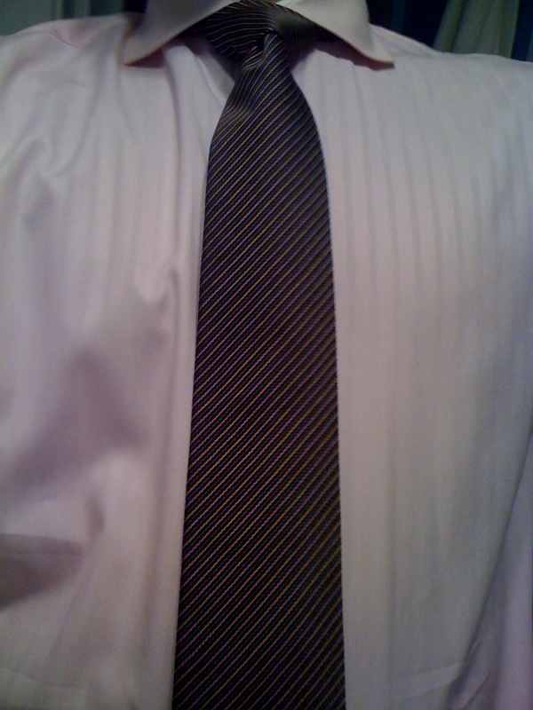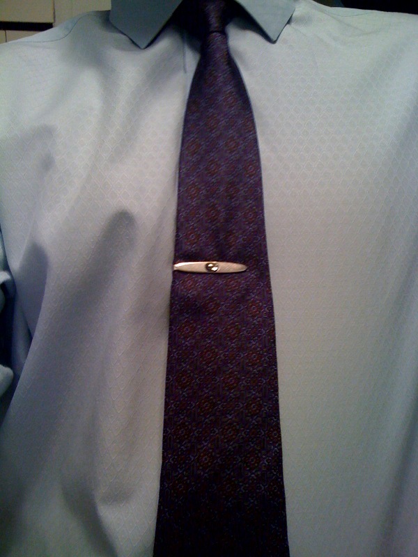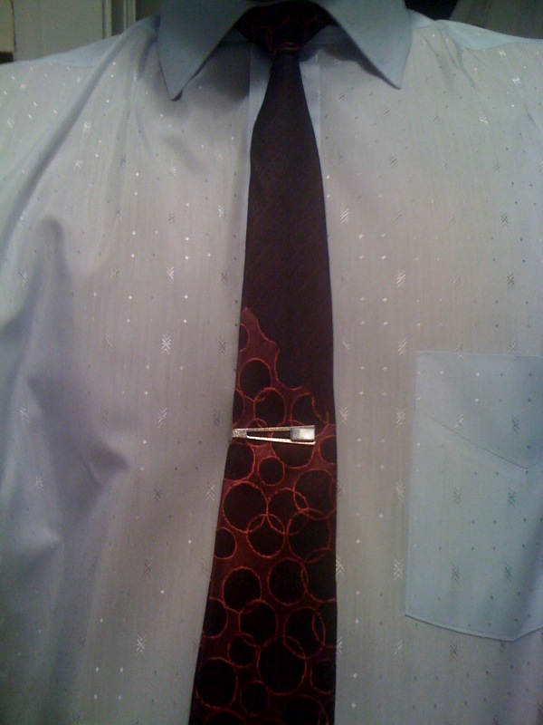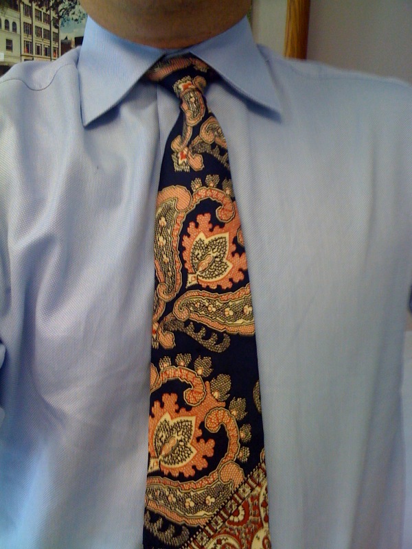 I have owned this Bow Tie du Jour for several years, and I can’t at all recall where I got it. There is no tag, so that gives me no help. I do dig it…bright yellow with the cool blue circular pattern. It looked very peacockish, especially since I put it under my seersucker suit and had white/brown saddles on.