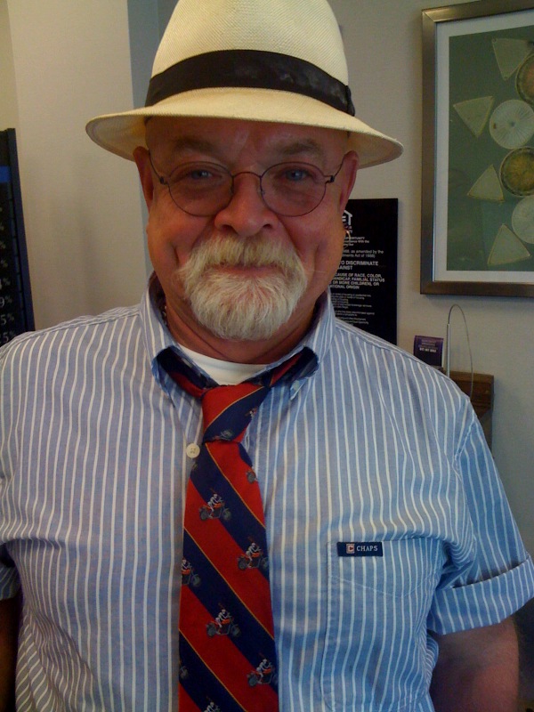 I have to admit that I was pretty stunned to learn yesterday that I have about 75 ties left to wear and write about. Today, though, I had a fun interaction when I walked into First Northern Credit Union, my financial institution that holds the money I have, fleetingly. I walked in as Rod was describing his MOST awesome tie. It’s got skeletons riding motorcycles on it. Skeletons! Riding on Motorcycles! That would immediately move into my Pantheon of Ties subcollection. I’d have a Motorcycles and Skeletons Week, and wear it every day. And I will strike down upon thee with vengeance, and FUUUUURIOUS anger, to those who would defy my tie-wearin’ authority!