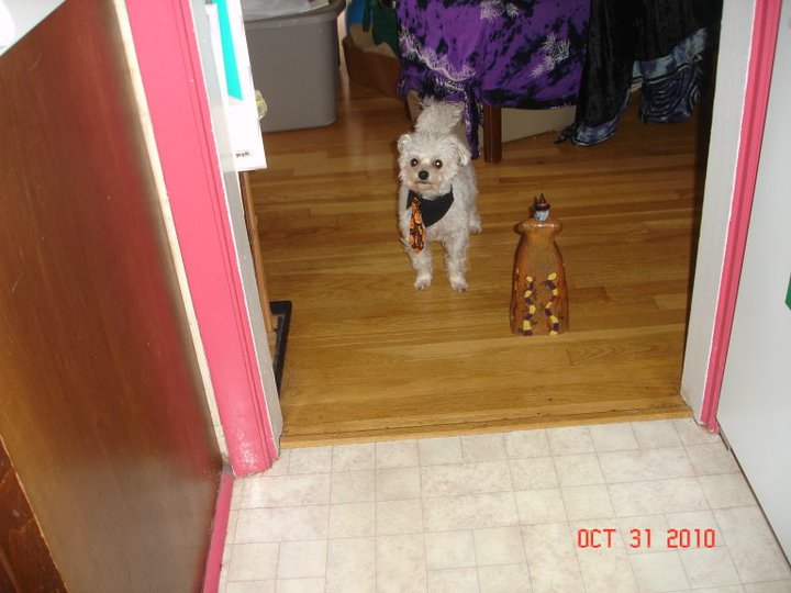 And now, after the profoundness of my ode-to-the-soldier soliloquy and my self-effacing diatribe, we now delve into what’s really important. DWT. Or should we make that CHCDWT (Cute Halloween-Costumed Dogs With Ties)? Here we have Elke, the canine companion of Dana Pearl (herself a Girl With Tie alum), dressed in her finest Jack-o-Lantern-themed tie.