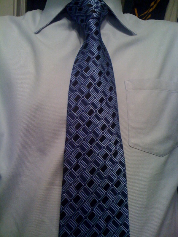 Okay, now that’s off my chest, unlike the Tie du Jour (nice segué, no?). I need to admit, sheepishly, that this TdJ photo is a lie. It’s not the first time I’ve had to recreate a tie/shirt combo due to FTP (failure to photograph), but it is the first time that the shirt that was actually worn had already gone off to the dry cleaners. PLUS (that’s not an acronym, I just wanted to put it in all-caps for emphasis), my helper/reminder actually helped and reminded me to snap the daily shot! Imagine my surprise today when I looked for the picture in my iPhone. You can’t, can you? My name is Lou. Lou Zerr.
