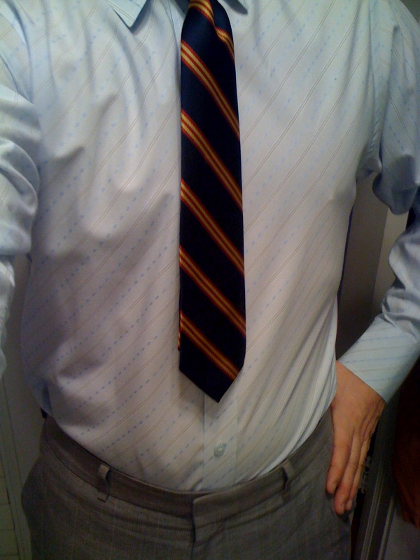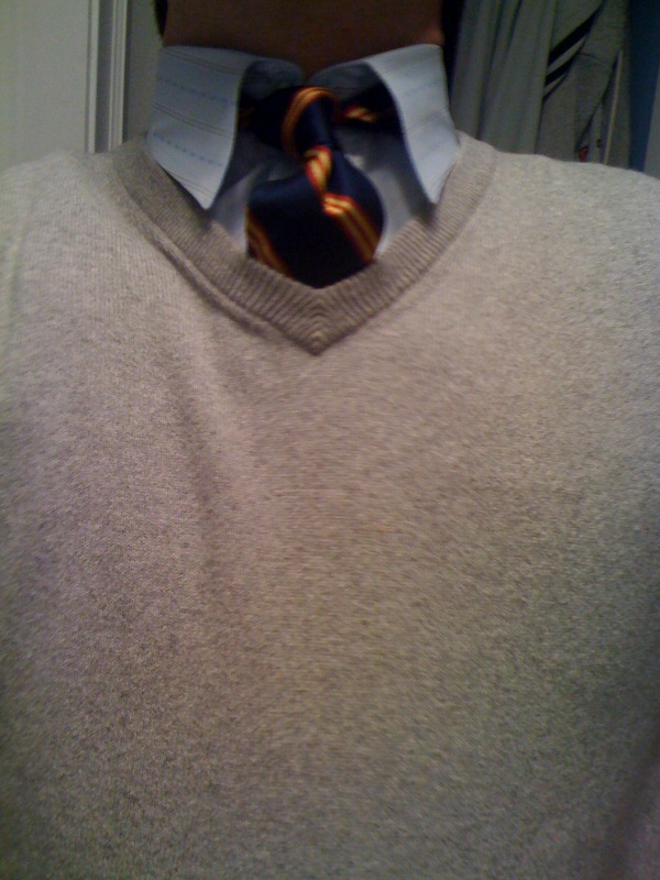 Speaking of ties, as I tied the Tie du Jour, I realized that it was the tie of a child. Not a particular child, mind you; as in, I didn’t steal it. But it was incredibly short: from the small picture on the right you can see that it only came down a couple inches short of my bellybutton. Did I replace it? Heck no. Thought of the solution as I tied it on: just throw a sweater on it. Bingo. Next time I’ll try a more colorful sweater…and by the way, it’s a tagless strip. No clue where it’s from.