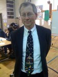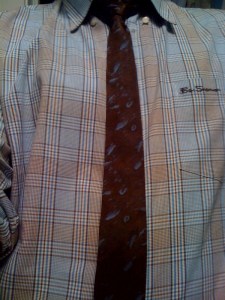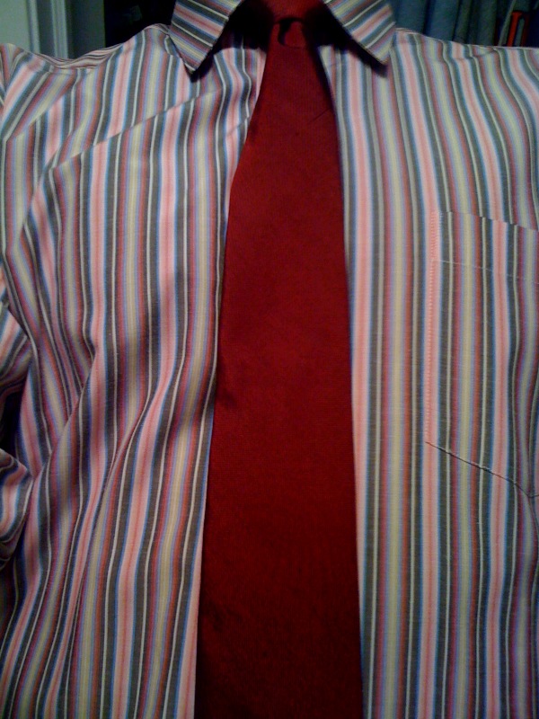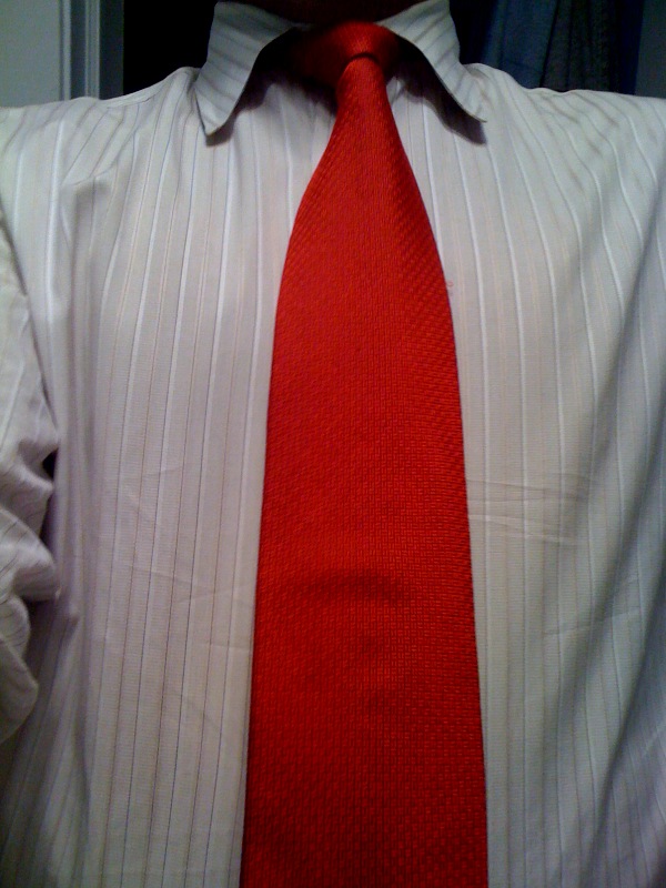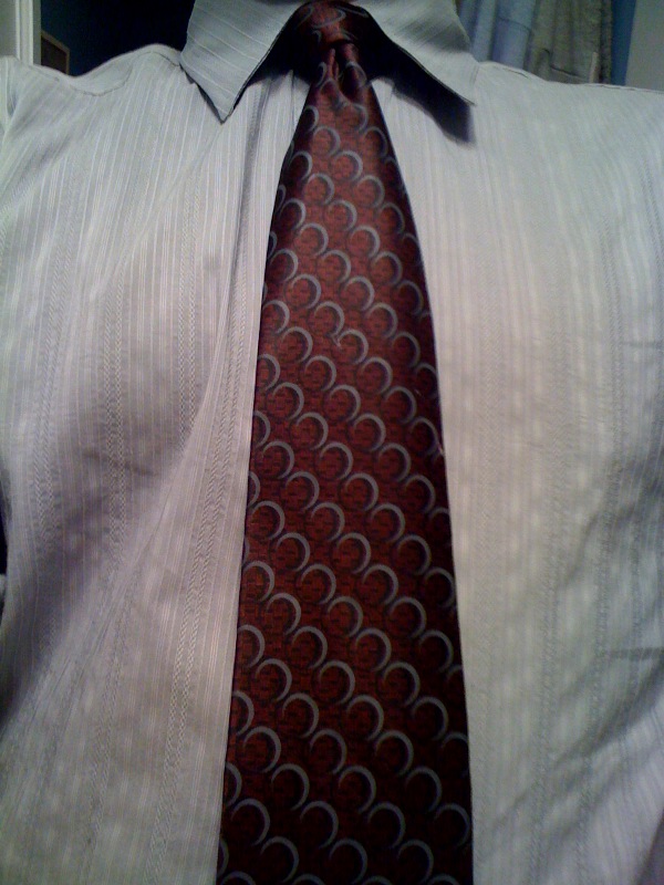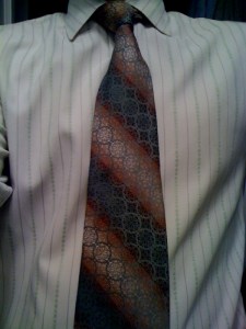I did manage to get some Guys With Ties today. With this first one, the Tie should look mildly familiar, as may the Guy. The Tie, of course, is today’s TdJ, and the Guy, although it’s difficult to prove, is yours truly. I don’t think there are many pictures of my face on this blog. Probably why readership is so good, nyark nyark. I love how it looks like my two friends are growing out of my shoulders–Lawrence Neisler over my right shoulder (your left) and Paul Hletko over my left/your right.