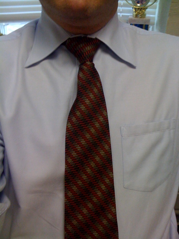 As for my Tie du Jour, it was a loaner from my friend David Colker. Every time he sees me in a tie, David gleefully informs me that he doesn’t have to wear them very much any more. So, last week, he gladly dropped off about a dozen or so, from his days as CEO of the Cincinnati Stock Exchange (which became the National Stock Exchange). This first one is from the house of [the brand name of this TdJ has been withheld, due to the fact that the author removed the tie at the office on Friday, and will not be able to retrieve the aforementioned brand name until he gets to the office around 11am], and it went really well with the houndstooth pants that aren’t seen in this picture. Trust me.