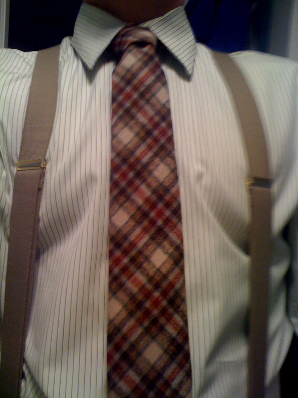 My plaid, wool tie (which goes smashingly with the suspenders/braces, wouldn’t you agree?) was a wonderful gift from my wonderful friend Jenny. She was proud to say that it cost only $1.49 at a thrift store; I, in turn, am proud to say that I felt like a thousand bucks wearing it. It’s from Pendleton, the celebrated maker of woolen clothing. Celebrated may be a stretch, but they are very famous. Sheep know to avoid going to work for them.
