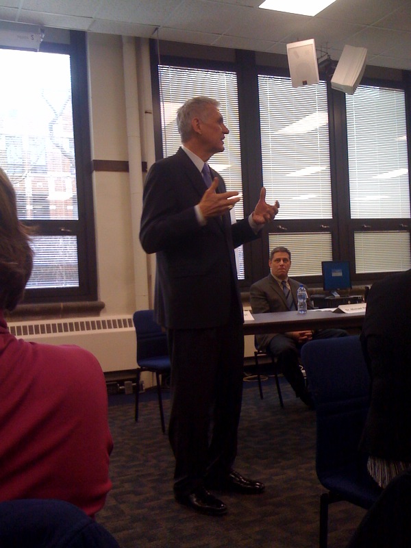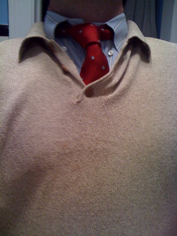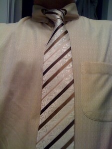 It’s rather staid, compared to the rest of my collection. It’s from the Claiborne line, which I was surprised to learn was entirely a JC Penney mark. Go, JC, go. I tried to pomp (or pimp works, too) it up with my blue shirt, but it didn’t really wake it up. Oh, well. I have mentioned recently (as I have before) that a quick glance at my tie rack makes it painfully obvious that there will be some painfully morose days coming up in the TdJ department. When I’ve had this problem before I’ve simply made a trip to the resale shop(s), but I gave up buying ties for Lent. Boring ties be damned, I may as well try to make a dent in the Unworn Collection, and 40 days won’t kill me.