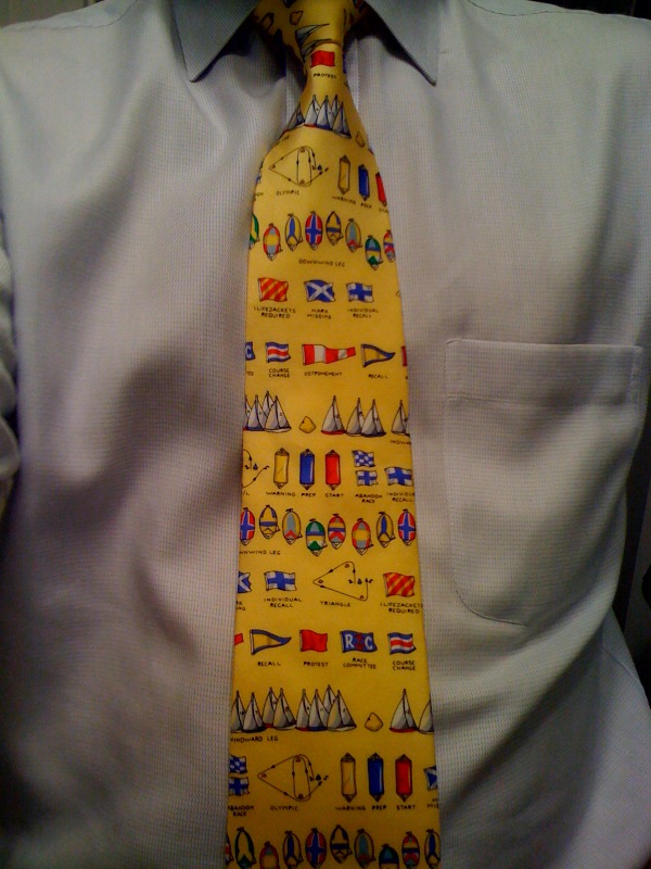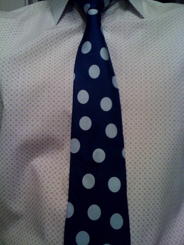 Throughout the day, my TdJ was called “whimsical”, “my favorite” and the fairly obvious, “polka-dotted”. My navy-field-with-sky-blue-dotted strip is from the Portfolio line of the Perry Ellis house o’ fashion.