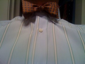 I’m sure that folks who saw me riding along wondered what the hell that guy with a bow tie was doing in the police car, especially once you see the ensemble (that’s a tan blazer, not yellow, as my crapiPhone would suggest). That would have taken the whole ‘good cop/bad cop’ thing to a different level. ‘Snazzy cop/sloppy cop’ or maybe ‘good fop/bad fop’ come to mind as suitable replacements, should the mighty bow make its way into the uniform of our men and women in blue.