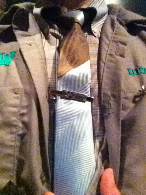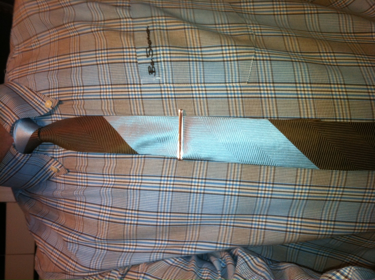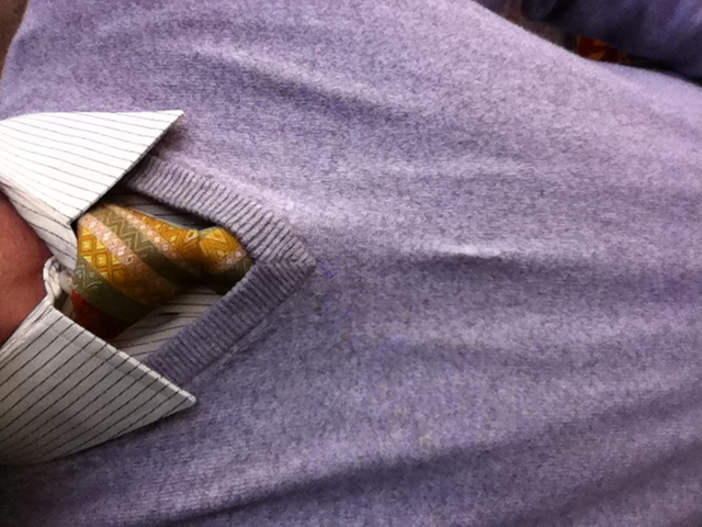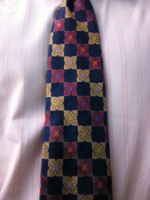 Anyway, the TdJ is from Beau Brummel, and it’s polyester. Dacron, orlon, klingon…does it really matter at this point? Yes, I hid it under a sweater, not because it was bordering on ugly, but because I found a stain (old Campbell’s soup…mmm, good) that I hadn’t caught — or tasted — at Unique Thrift Store. The knot gives you plenty of perspective on its, um, colorfulnessosity.