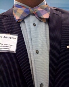 I have a Guy With Tie, from my weekend. Terry Donohue, an attorney with Inman & Fitzgibbons. I met Terry a few months back through some Evanston Chamber functions, and I spotted him at Dominick’s, as he was headed to his daughter’s bat mitzvah (at least I think it was his daughter’s…or maybe a friend of hers?). Anyway, thanks for being a good sport, Terry. It can be odd, I’m sure, when someone takes out their iPhone, and says, “I have this tie blog…can I take your picture?”