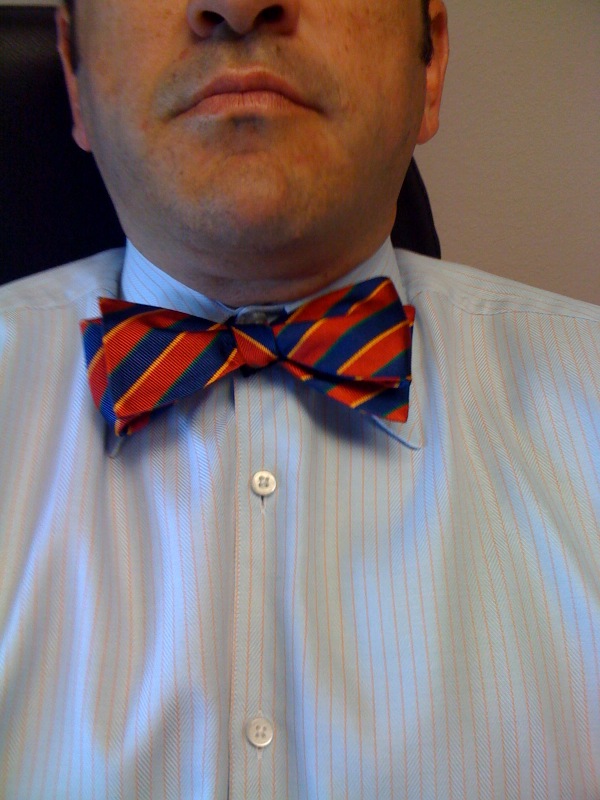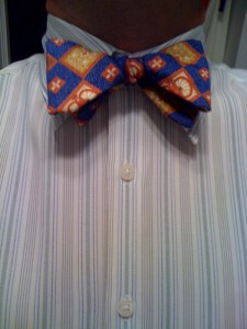 My Bow Tie du Jour, or Noeud Papillon du Jour, is a tie that Patrice’s widow, Annie, sent to my mom. The card reads “souvenir très affectueux”–very affectionate souvenir.