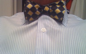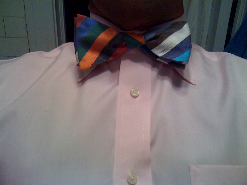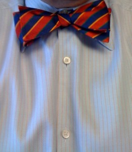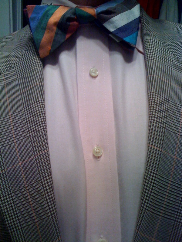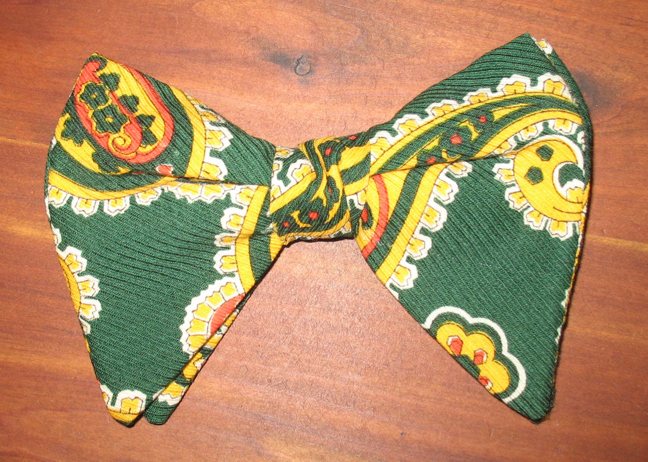 My picture is not very good, but the bow tie is a forest green with some very cool paisleys. It’s smaller than most, if not all, of my bow ties (my good friend Dan Murrell would appreciate its being 2″ wide…very classic). No brand label, so I imagine that some perfectionist tailor in Paris made it.