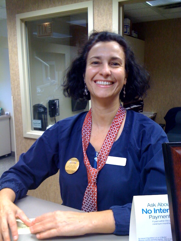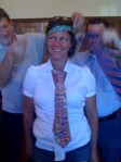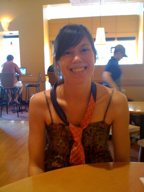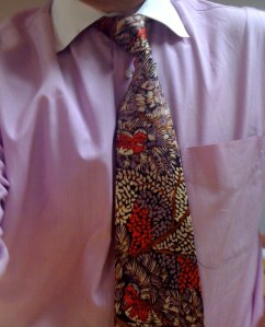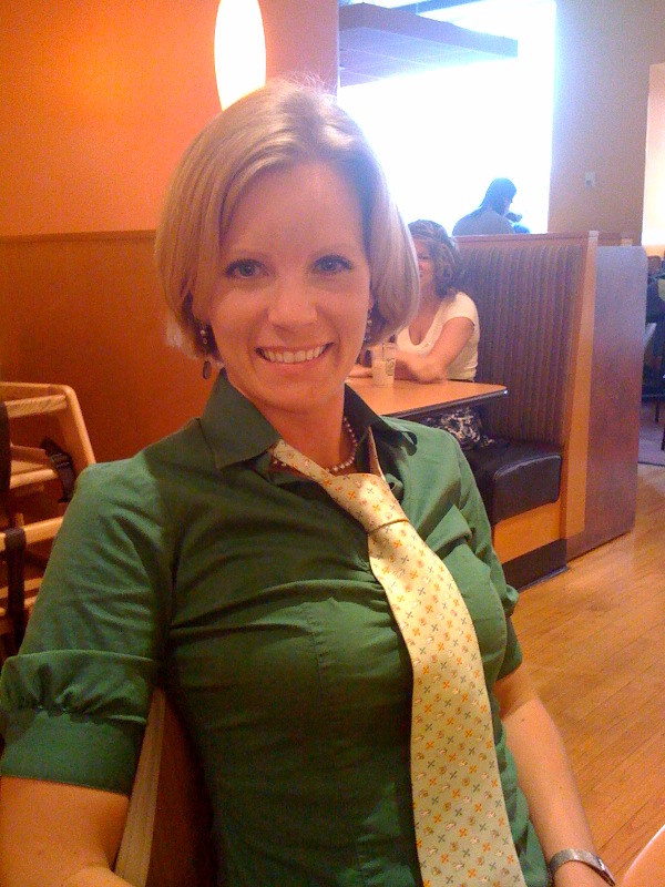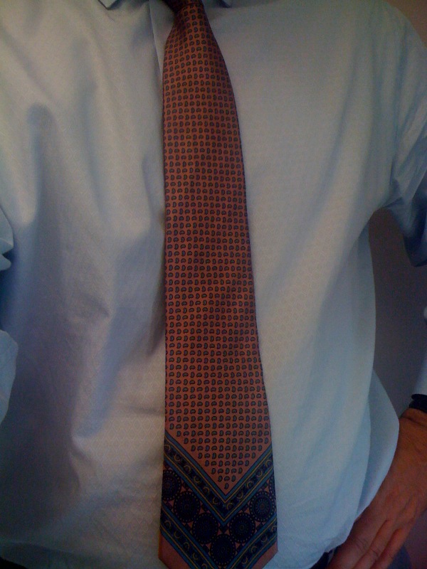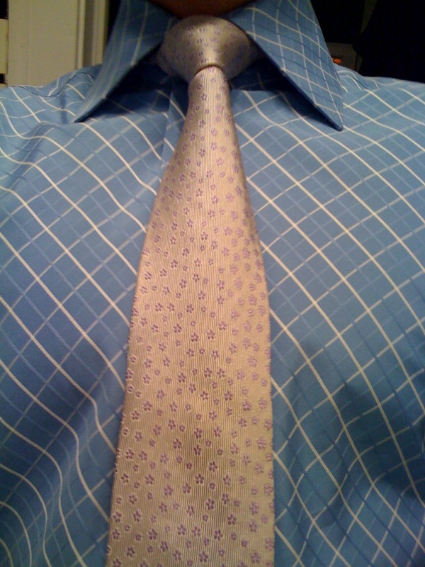 My gift Tie du Jour comes from far, far away. Diane brought back this tie from Korea…it’s very sparkly. Not sure if you can see the small diamonds attached to the flowers. Oh, I’m sure they’re real. The brand is Kissa, which I assume is Korean (really, Brooke! how’d you figure that?).