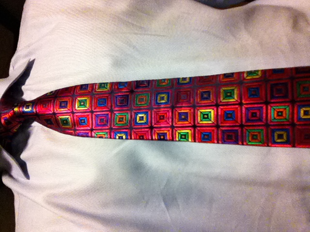 Please do not read this post if you have 1) a heart condition 2) an eye condition or 3) one of those strobe-light, Mary-Hart-voice response afflictions. My Hallowe’en party tie du jour was affected by my choice of costume. You’ll see…