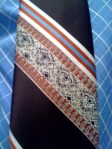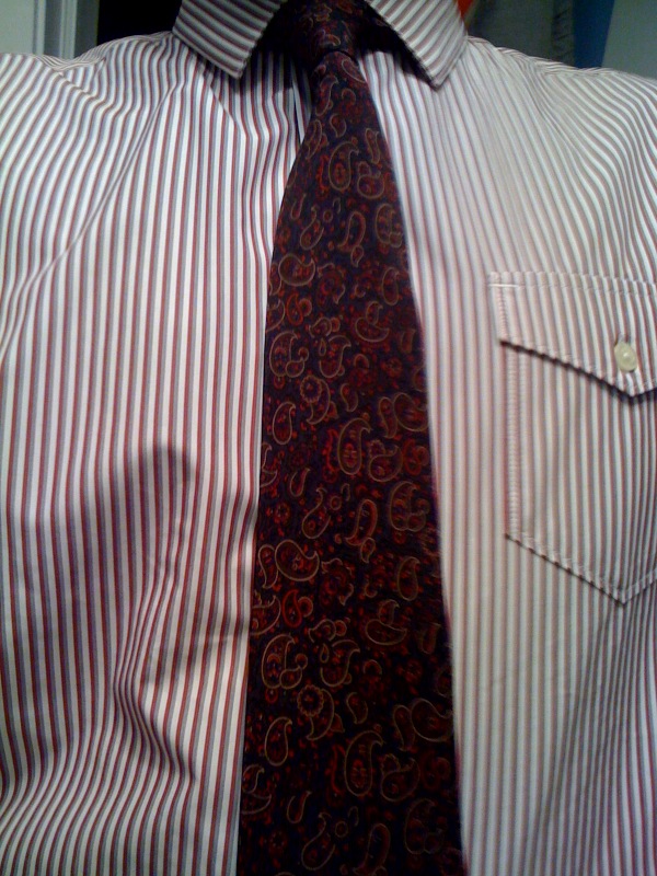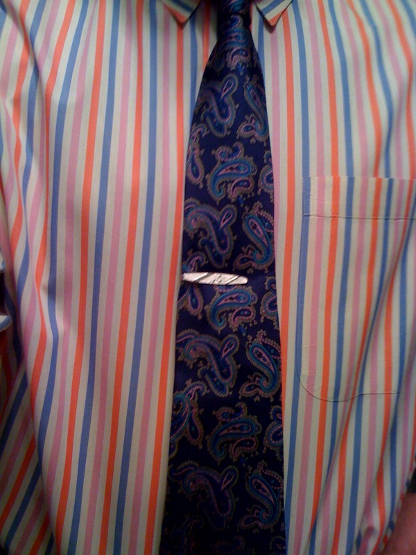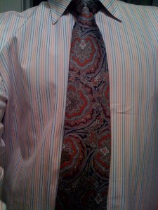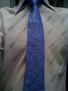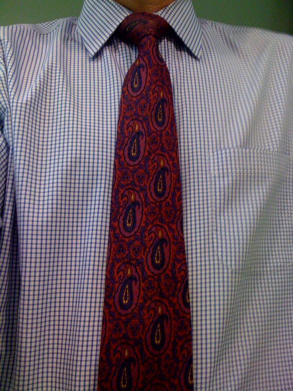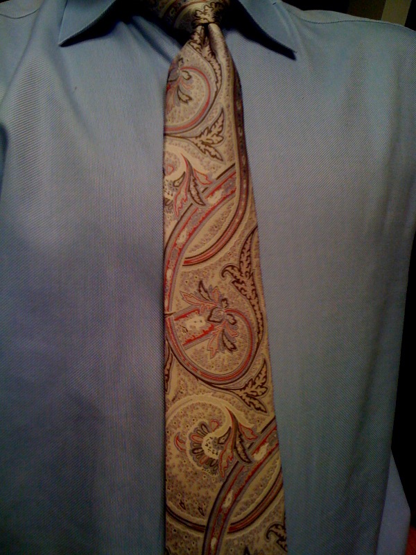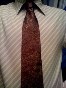As for my Friday, no one gave me a framed tie, nor did I leave a high-powered Washington gig. But, I did wear a tie, as I have done a few times. And, yes, I did remember to close out Paisley Tie Week. I didn’t close it out with a flourish, which is kind of a surprise. My TdJ was rather plain: muted tones, small paisleys. It’s a vintage strip from Besley’s Inc., sayeth the label. A quick journey to the land of Google tells me that Besley’s was purchased by the Robert Daskal Group in the 80s, and that they still make ties today (or at least until their website lost a webmaster). I got this at Unique, and I actually have an almost-exact replica, which is only slightly varying in color. A few months ago, I bought a bunch of ties to see if I could figure out a way to make pocket squares out of the tips; I figured it out, but I never cut up the ties. This is one of those ties that were almost cut up for business.