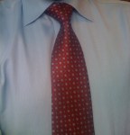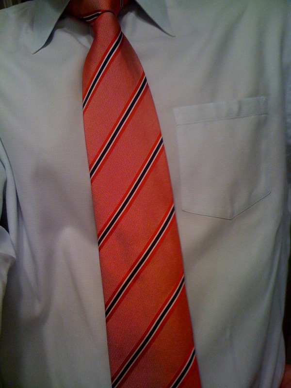 The label says Hawkes & Keynes, London, but my guess is that my folks picked it up from a London street vendor. While the pattern is kinda cool–the paisleys seem to have been created in blue Sharpie and yellow Hi-Liter–there isn’t much liner going on. When you don a really quality tie, you can tell by the knotting, and just kind of how it flows between your hands. Hard to explain.