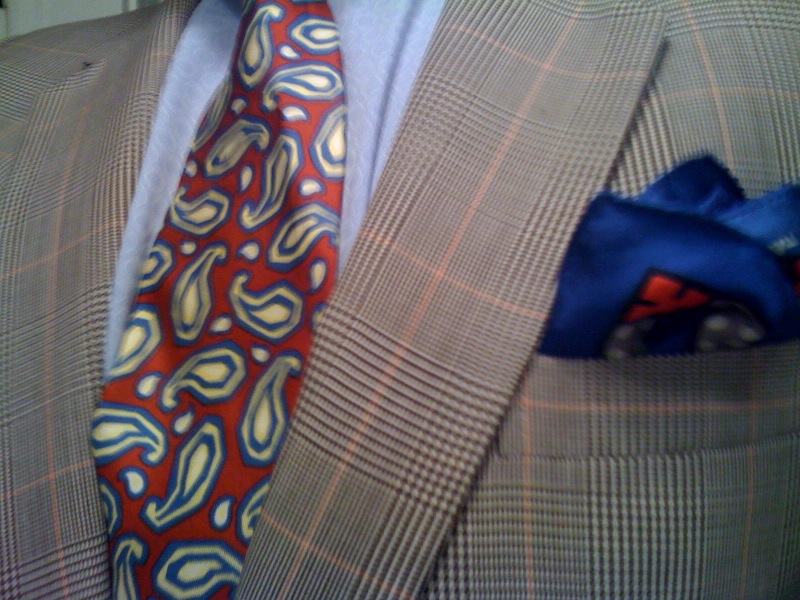 Anyway, I put this with a new (to me) suit that I found at the Hadassah House Resale Shop, at 5020 W. Dempster in Skokie. It’s from Yves Saint Laurent, a beautiful brown Glen plaid (aka Prince of Wales check) with a red (what else? It’s RED! TIE! WEEK!) stripe cutting through it. Throw in a blue scarf-cum-pocketsquare, and I was in bidness.