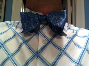 Part of my fresher ensemble was cedntered around TdJ#2, my bow tie from Paul Fredrick, picked up on their website recently. This is that cornflower blue that I love, and the fabric is just top-quality. This and my diamond-patterned shirt went nicely with my new Astor & Black suit. I’ll have to make an ensemble photo with that soon.
