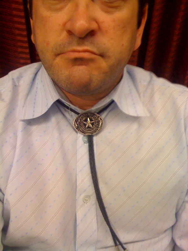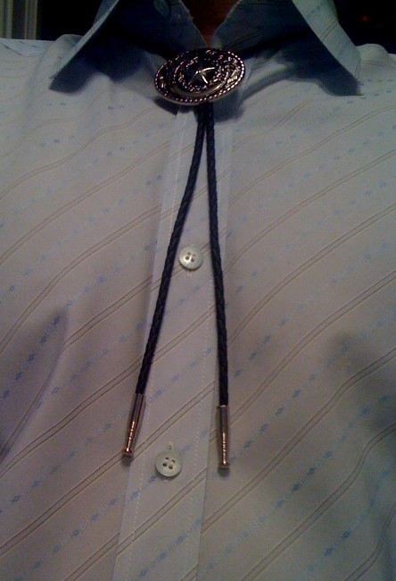 All of that to get to our Tie du Jour, from deep in the heart of Texas. Yes, Neal Pearlman, half of your dream has come true! I wore a bolo tie! Now if I can just find an ascot…but I think I have a line on one. Then I’ll just need to learn how to tie it…AND get invited to a regatta or a country club board meeting.